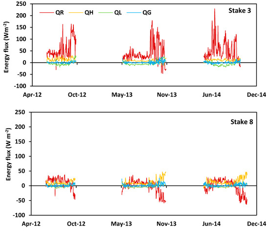 Daily mean values of energy balance components at stake locations 3 and 8 of Yala Glacier during the period 5 June–13 October 2012, 8 May–19 November 2013 and 5 May–15 November 2014.