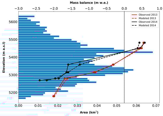 Modelled (Red dotted line for 2013 and black dotted line for 2014) and observed (red line for 2013 and black line for 2014) mass balances for May–November 2013 and May–November 2014. Area coverage in each altitudinal zone ranging from 5143 m a.s.l. to 5681 m a.s.l. Hypsometry of the Yala Glacier (blue bars).