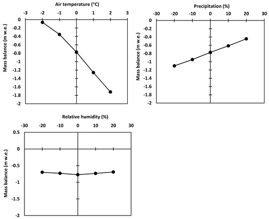 Sensitivity test of mass balance to the input variables; air temperature, precipitation, and relative humidity.