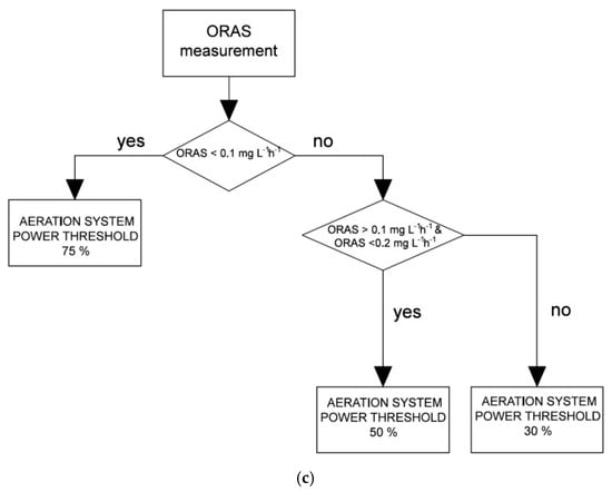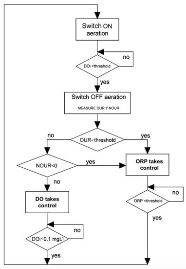 The aeration control (Figure 1) starts by switching on aerators, which remain in this state until DO reaches a certain threshold, whose value must be such as to ensure the transformation of ammonium into nitrate and to allow the accumulation of a fraction of organic matter inside the vessel [21,22]. When this happens aeration is switched off and a non-aeration cycle starts. Then the algorithm calculates OUR and compares it with another threshold.