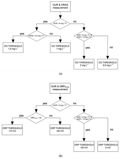 - Standard organic matter concentration: 6 mg L−1h−1< OUR < 12 mg L−1h−1. This is the standard working conditions previously described in the algorithm adjusting DO. A threshold of −30 mV will ensure that organic matter is removed and denitrification is carried out.