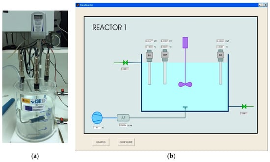 The multilevel adaptive control proposed in this work has been tested in a laboratory prototype (Figure 3) designed to reproduce the behavior of an actual WWTP. It is a 3 L cylindrical vessel (manufactured by the authors) with two probes, one for DO (VISIFERM DO ARC 120 from Hamilton) and the other for ORP (EASYFERM PLUS ARC 120, also from Hamilton), one stirrer and one aeration system with an air flow probe. Two valves were added to the vessel: one at the bottom, to allow sludge to be removed from the process, and the other at the top, to allow treated water to flow out to compensate for the incoming polluted water. Two peristaltic pumps were also included: one to feed the vessel with polluted water and the other to extract the excess sludge. A pH probe was also included, although it was not used to control or monitor the process because, as pointed out in “2.1. Control parameters description”, variations in the values measured were too small (they appeared in the second or third decimal place) to take this variable into account.