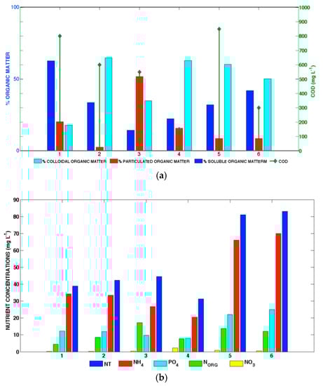 Mean values of organic matter and nutrient concentrations of the six patterns used to characterize the 150 influent samples treated by the prototypes. (a) COD (colloidal, particulate and soluble organic matter percentages). (b) Nitrogen forms and Total Phosphorous.