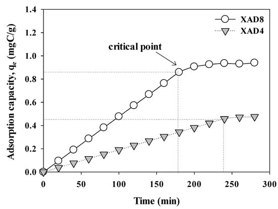 The kinetic profiles of the adsorption of AHA on the XAD 8/4 resins are shown in Figure 2. The adsorption capacities of both resins increased with time and reached the saturation condition. The XAD 8 resin adsorbed a higher amount of AHA than did the XAD 4 resin, which is in good agreement with previous studies regarding the adsorption of humic substances with the same resins [8,20]. The chemical structure of the XAD 8 resin is that of an acrylic non-aromatic ester, while that of XAD 4 is a styrene divinylbenzene copolymer resin containing aromatic and very HPO characteristics. Since the adsorption capacity of XAD resins is affected by chemical composition, it caused a difference in adsorption capacities between XAD 8 and XAD 4 resins [8]. In addition, the large pore size of the XAD 8 resin (>25 nm) induces rapid adsorption by diffusion of macromolecules into the resin matrix compared with that of the XAD 4 resin (<5 nm) [11]. Thus, a large amount of AHA, which is a HPO macromolecule, could be adsorbed by the XAD 8 resin.
