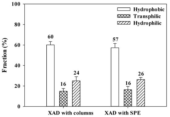 The samples were fractionated using the XAD 8/4 resins with the columns and with the SPE cartridges (Figure 6). The percentages of fractions in each sample were very similar in the samples when comparing the experimental results for the column and for the SPE cartridge. Both experimental results showed that MW-NOM was fractionated into ca. 62% HPO, ca. 10% TPI, and ca. 28% HPI organic matter. HR-NOM had a large portion of HPI organic matter (60%) and contained 23% HPO and 6% TPI organic matter. The results showed that the method with the SPE cartridge packed with XAD 8/4 resins can accurately fractionate various NOMs with different hydrophobicity and conductivity values.