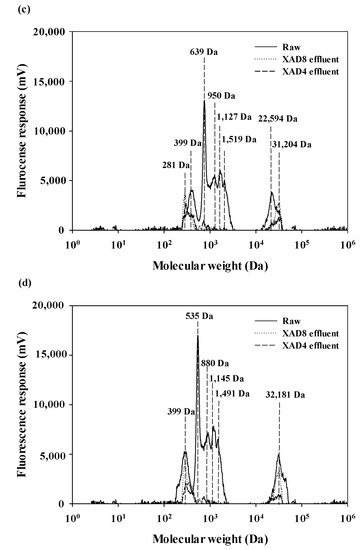 The results of fluorescence absorbance of the samples showed the same pattern as that of UV absorbance (Figure 4c,d). The AHA solution also contained protein-like substances, which are detected by fluorescence absorbance, with MW ranges from 281 to 32,181 Da. The effluent solution passed through the XAD 8 resin in the column, and the SPE cartridge had smaller MW ranges from ca. 639 to ca. 1519 Da owing to adsorption of the resin. Since most of the HPO organic matter is adsorbed on the XAD 8 resin, the amount of DOM in the effluent from the XAD 8 resin is smaller than for the AHA solution, resulting in the lower fluorescence response. Although the effluent from the XAD 4 resin with the columns and SPE cartridge showed almost the same MW distribution for the XAD 8 effluent sample, the amount of DOM in the effluent, whose MW ranges from ca. 22,594 to ca. 31,000, was significantly reduced when passed through the XAD 4 resin. This indicates that protein-like substances with high MWs can be adsorbed more onto the XAD 4 resin than onto the XAD 8 resin.