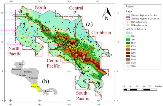 (a) Location of rain-gauge and Digital Elevation Model (DEM) for each climatic region in Costa Rica during the period 1961–1990. (b) Position of Costa Rica in Central America.