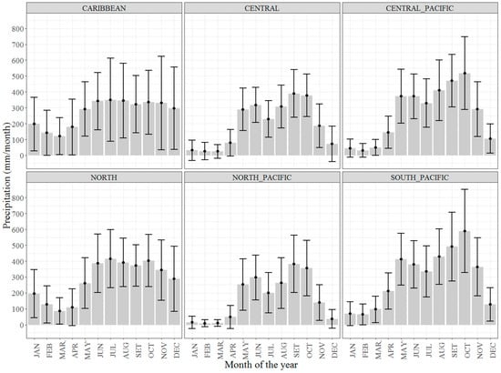 Mean monthly precipitation derived from all available rain-gauge stations for each climatic region in Costa Rica during the period 1961–1990. Error bars represent the standard deviation.