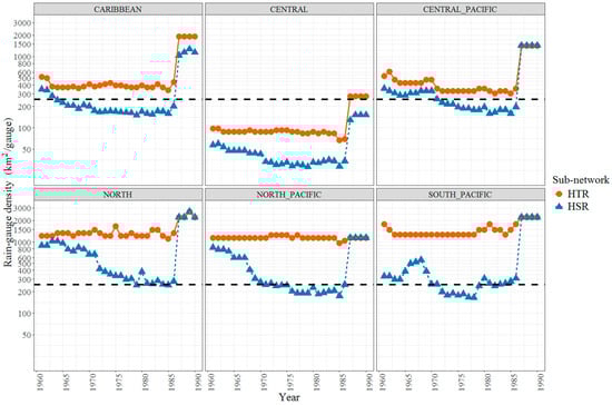 An analysis of the temporal evolution of both sub-networks across all climatic regions shows that precipitation data were collected from a constantly changing configuration during the entire study period, which peaks in the mid-1970s and starts to decrease in the mid-1980s, with a drastic drop after 1987, when many stations all around the country were either abandoned or relocated (Figure 3). The HSR sub-network satisfies World Meteorological Organization (WMO) standards of 250 km2/gauge for mountainous areas [46] in the Caribbean, Central-Valley and Central-Pacific regions during most of the 1970s and 1980s, with the Central-Pacific not reaching the minimum value during most of the 1960s. North, North-Pacific and South-Pacific regions, however, barely reach that standard during most of the 1970s and 1980s, with the North region being the most critically instrumented area, particularly during most of the 1960s. In contrast, the HTR sub-network only satisfies WMO standards for the Central-Valley region, since rain-gauge stations seemed to concentrate in the most populated region of the country. After 1987, however, only the Central-Valley region satisfies WMO standards. All other regions are way above the 250 km2/gauge after 1987 regardless of HSR or HTR, as there barely four operational stations in each region. Quality control of the IMN precipitation data was undertaken to identify possible systematic or acquisition errors and extreme outliers.