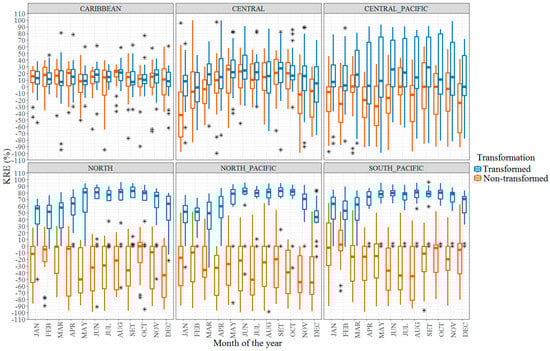 On the other hand, performance of the kriging variance-reduction (KRE) noticeably benefited from the Box–Cox optimization technique when applied to the North, North-Pacific, South-Pacific and Central-Pacific regions, since in most cases non-transformed datasets produced predominantly negative KRE values regardless of dry or wet months (Figure 4), which proves that data transformation did improve Gaussianity of the precipitation field. Furthermore, for the North, North-Pacific and South-Pacific regions, interquartile ranges are hardly distinguishable for most non-transformed boxplots, indicating that precipitation is a highly skewed, heteroscedastic and intermittent field in nature, which usually contradicts the assumptions of data normality [31]. This seems particularly evident in Costa Rica, as mean monthly precipitation exhibits a strong seasonal cycle and regional variability (Figure 2). Data transformation, nonetheless, is not as beneficial for the Caribbean and Central-Valley regions, both of which exhibit the highest network densities (Figure 3). On one hand, non-transformed KRE values outperform their corresponding transformed counterpart during the wettest months (May to October) for the Central-Valley region. The opposite situation occurs during the driest months. On the other hand, the Caribbean region, which exhibits the most persistent year-round precipitation regime (Figure 2), shows little gain in applying data transformation, suggesting a more normally distributed spatial pattern as compared to the remaining climatic regions. In summary, data transformation seems to be more effective in regions with lower network densities. In regions with higher network densities, however, data transformation is more effecting during the wettest months.