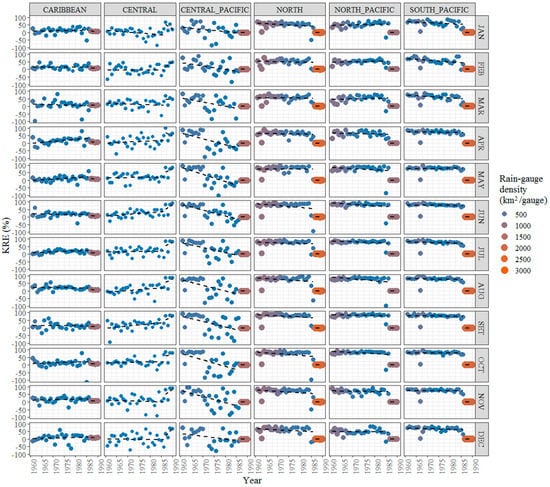 The temporal increase in rain-gauge density observed from 1961 to 1987 (Figure 3) does not seem to significantly impact KRE values for the North, North-Pacific, South-Pacific and Caribbean regions regardless of wet or dry season, since temporal observed-trends remain fairly stable throughout that segment of the study period (Figure 6).