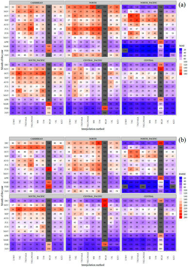 Cross validation heatmaps of MAE (Figure 7a) and RMSE (Figure 7b) mean monthly values (colour gradient in absolute units of mm/month, text-labels expressed as percentage with respect to the corresponding mean monthly precipitation) show that for all climatic regions, IDW, OK and KED rank the highest positions of all evaluated interpolation methods (Table 2), since significantly lower deviations (both absolute and percentage) are obtained when compared to the remaining interpolation methods. In the case of the Central-Pacific region, nonetheless, IDW, TPS and KED occupy the highest-ranking positions regarding MAE, and IDW, NN and KED regarding RMSE. All other deterministic methods considerably deviate from IDW, OK and KED both in absolute units and as percentage; particularly MQS, which seems unreliable to apply in all regions except the Caribbean and the Central-Valley. Furthermore, MAE and RMSE results from IDW, OK and KED methods reveal similar patterns of monthly precipitation distributions within each climatic region, whereas all remaining deterministic methods produced considerably different seasonal patterns throughout the year, mainly during the wettest months (July to November).
