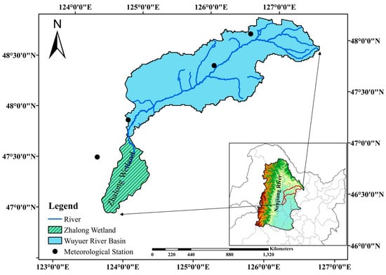 The Wuyuer River originates from the west of the Lesser Khingan Mountains and travels a total length of 576 km with a drainage area of 15,084 km2. It flows through six counties, i.e., Bei’an, Kedong, Keshan and Baiquan, Yi’an, and Fuyu, before draining to Zhalong Wetland. Zhalong wetland is one of the most important Ramsar international wetlands and supports diverse ecosystems and endangered wildlife species. Wuyuer River Basin (WRB) has a typical inland semi-arid climate and is the largest inland river in Heilongjiang province located in Northeastern China (Figure 1). It is dry and cold in winter, yet hot and rainy in summer. The annual total precipitation is about 500 mm, mainly concentrated during the period of June to September and it is the main source of the water for the WRB. Annual evapotranspiration in the WRB is 1110 to 1780 mm, much higher than the precipitation. WRB has a population of 1.7 million inhabitants, 1.24 million of which make their living from agriculture [33]. The water supplied by the river is recognized as crucial to agricultural irrigation and wetland health. With the effects of global climate change, more extreme hydro-meteorological events (especially droughts) are occurring in this area [34,35]. These pose severe threats to agriculture production and wetland conservation. However, droughts in WRB have been under studied and no comprehensive assessment is available. In this study we aim to provide a comprehensive drought assessment using four DIs (drought indices) with various timesteps.
