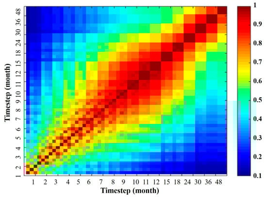 Pearson correlation coefficients between drought indices for various timesteps. Notes: Each time step consists of three different indices (one pixel for each DI in the order of PN, Z-Score, and SPI).