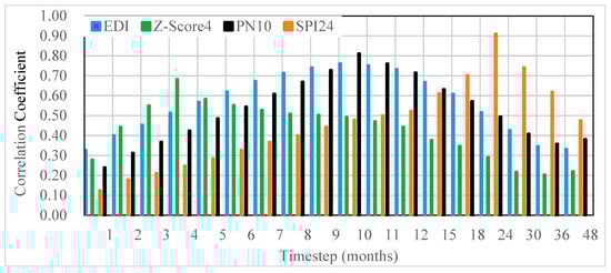 Average values of correlation coefficients of each DI (Z-Score4, PN10, SPI24, and EDI) against other DIs were calculated for each timestep (Figure 3). For example, the blue bar in the first timestep shows the average of three coefficient values (i.e., the coefficient between EDI and PN1, the coefficient between EDI and Z-Score1, and the coefficient between EDI and SPI1), and the first green bar represents the average of three coefficient values (i.e., the coefficient between Z-Score4 and Z-Score1, the coefficient between Z-Score4 and PN1, and the coefficient between Z-Score4 and SPI1), and so on.