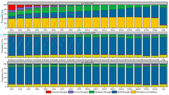 Compared to PN and Z-Score indices, SPI is more consistent with EDI in drought estimation (Figure 4c) with relatively good performances for almost all timesteps. Again, estimations by SPI using intermediate timesteps were more reliable than other timesteps. SPI using shorter timesteps showed an exact estimation of mild droughts and normal-wet conditions as EDI did. However, the identification of other drought types was poor, with moderate droughts being underestimated while extreme droughts and severe droughts were overestimated. Generally, SPI with longer timesteps displayed a similar estimation with that with shorter timesteps. Interestingly, SPI24 greatly overestimated moderate droughts, but underestimated mild droughts when compared with EDI.