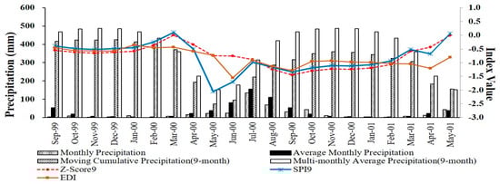 When comparing the indices and precipitation variables in 9-month timestep, recurring deficits between monthly precipitation and average monthly precipitation were observed (Figure 5). The largest deficit happened from September to November 1999 and in June 2000, with monthly precipitation not even reaching a half amount of the long-term average value for each month. The deficit of the moving cumulative precipitation compared with multi-monthly average precipitation declined gradually from September 1999 to March 2000, implying a mitigation of drought conditions, but then increased from April to June in 2000, as drought conditions took hold again. However, the deficit stabilized from July 2000 to May 2001, and then decreased from March to May 2001, after which time drought conditions ceased.