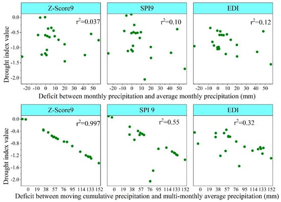 The scatter plots of drought indices and precipitation deficit in the nine-month timestep were shown in Figure 6. DIs ((i.e., Z-Score9, SPI9, and EDI)) did not reflect the deficit between monthly precipitation and average monthly precipitation very well, and r2 was only 0.037, 0.10, and 0.12 respectively. However, DIs had a statistically close relationship with the deficit between moving cumulative precipitation and multi-monthly average precipitation for the nine-month timestep with 0.997, 0.55, and 0.32 values of r2.