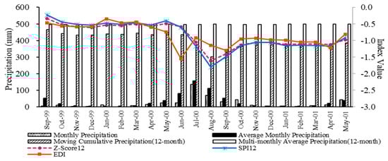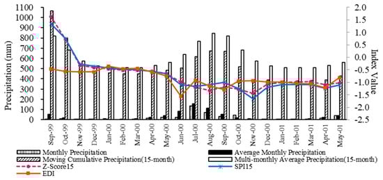 It is known that there were four significant droughts in Keshan, i.e., from autumn 1999 to spring 2000, autumn 2000 to spring 2001, autumn 2002 to spring 2003, and autumn 2004 to spring 2005 [39]. Therefore, we enrolled the period from September 1999 to May 2001 as the representative drought period in Keshan, and the DIs were calculated based on the data of Keshan station during this period. Based on the prior analysis among DIs, only EDI, and Z-Score and SPI in intermediate timesteps (9, 12, and 15 months) were selected to identify how DIs coordinated with the historical deficiency conditions of monthly and multi-monthly precipitation.
