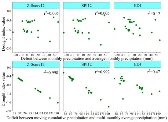 Based on the correlation analysis shown Figure 8, it was further found that Z-Score12 and SPI12 did have a weak relationship with monthly precipitation variability (r2 = 0.005). While they showed a significant correlation with deficit between moving cumulative precipitation and multi-monthly average precipitation, and the r2 was 0.998 and 0.992, respectively. Correlation between EDI and water deficit indicated by moving cumulative and multi-monthly average precipitation in 12-month timestep was also better than its relationship with monthly precipitation change, but the r2 was 0.47, which is not as strong as the other two indices were.