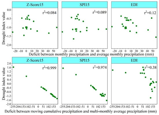 Scatter plots of drought indices (i.e., Z-Score15, SPI15, and EDI) and deficit between monthly precipitation and average monthly precipitation (the first row) and deficit between moving cumulative precipitation and multi-monthly average precipitation (the second row) for the 15-month timestep in Keshan station from September 1999 to May 2001.