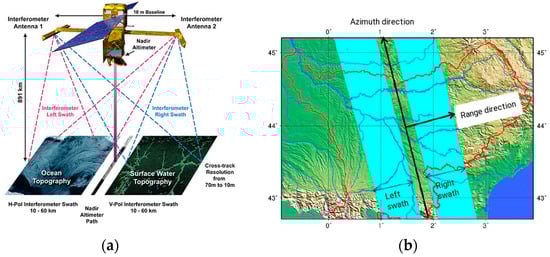 The observation of water elevations from space provides important information for many physical processes in hydrology. In the continental domain, the open water surface elevations of lakes and rivers can be observed by altimetry satellites. The SWOT mission (the launch of which is expected in 2021) is a wide swath altimetry mission able to measure the spatial and temporal evolution of the open water surface elevation of oceans, lakes and reservoirs, and rivers on the continental surface between 78° S and 78° N []. The nominal SWOT mission lifetime is 3 years. The principal SWOT payload is the SAR (Synthetic Aperture Radar) KaRIN (Ka-band Radar INterferometer), developed at the JPL (Jet Propulsion Laboratory). The instrument has two antennas separated by a baseline distance of 10 m (Figure 2a): By observing the same area from two different positions, the estimation of the elevation and the position of the target can be deducted. Each swath, from either side of the nadir area, is 50 km wide and they are separated by a distance of 20 km.