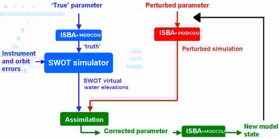 OSSE are widely used to validate DA algorithms and strategies before working with real-data. They offer a convenient framework for the testing of various hypotheses on observation errors, observation spatial and temporal resolution, model error, the choice of DA algorithm, or the cycling of the analysis. Knowing a SWOT’s orbit and pass plan over a 21-day cycle allows the extraction of SWOT-like data from a reference simulation output of ISBA/MODCOU over the Garonne catchment. The settings of the reference simulation (noted SIM_TRUE, blue box on the top, Figure 3) features unperturbed forcing and parameters resulting from the calibration of a RAPID model with a 1 or 2 km resolution []. An error of 10 cm standard deviation is added to the SIM_TRUE outputs to get some virtual SWOT-like observations averaged over a 1 km2 area (blue box on the bottom, Figure 3). This simple hypothesis will be further investigated in Section 4.4. A perturbed set of forcing and parameters, xb, is then used to run the background integration (noted SIM_PERT, red box, Figure 3) in which synthetic SWOT data are assimilated to retrieve the unperturbed forcing and parameters. The analysis branch (noted SIM_ANA, green box, Figure 3) for the control vector, xa, allows then the calculation of the corrected parameters to provide corrected river depths and discharge. The DA analysis is carried out over a sliding time window covering several observation times beyond which a forecast can be issued. The tool used to set up our DA scheme is the Open-PALM (Parallel Assimilation with a Lot of Modularity) software [,] developed at CERFACS (Centre Européen de Recherche et Formation Avancée en Calcul Scientifique) and ONERA (Office National d’Etudes et de Recherches Aérospatiales). This software allows the coupling of codes of calculation between them, and in this way, allows the exchange of variables, such as vector or matrix, between these codes. OpenPALM provides a parallel environment based on high performance implementation of the Message Passing Interface standard: This interface is able to perform both data parallelism and task parallelism [].