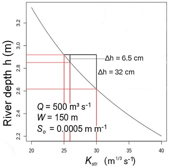River depth, h, as a function of the roughness coefficient, Kstr, for a large rectangular river channel, with geomorphological parameters and a discharge value typical of large plain rivers.