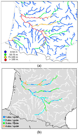 With this methodology, all pixels within the river network that lies in the swath polygons could be potentially observed. Yet, SWOT is conceived to observe rivers wider than 100 m (requirement) and could even observe rivers wider than 50 m (goal). To take this limitation into account, only river portions that were wider than 50 m were considered in this study. Furthermore, the 10 cm accuracy on water elevation is only met after aggregating SWOT data over 1 km2 []. That is why Strickler coefficients, Kstr, and river depths, h, from the reference simulation are aggregated over 10 km reaches (5 to 10 RAPID grid cells) to meet this requirement, before adding the noise on water depths. The aggregation is operated by averaging the values in the considered grid cells, with a weighting proportional to their length (1 or 2 km). The area of each reach varies from 0.5 to 2 km², knowing that the computed width varies from 50 m to 200 m. A total of 165 reaches (Figure 5a) were constituted. Over the study domain in our experimental set-up, reaches were observed between one and four times per repeat period (Figure 5b).