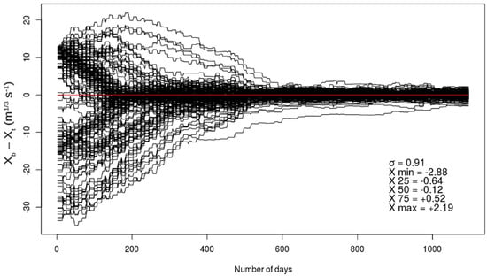 Temporal evolution (1 August 1995 to 31 July 1998) of the difference between the a priori control vector (xb) and the true control vector (xt) of the Strickler coefficients in the DA system. The 165 black curves represent the value (xb − xt) at all 165 reaches defined over the Garonne catchment. The red horizontal line is equivalent to a zero difference between xb and xt. After 3 years (i.e., 548 48 h-assimilation windows), we represent the standard deviation, σxb, between the 165 values (xb − xt) in the basin. The X terms represent, from top to bottom, the minimum value, the 1st quartile, the 2nd quartile, the median, the 3rd quartile, and the maximum value of (xb − xt) at the end of the experiment (day n° 1096).