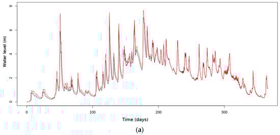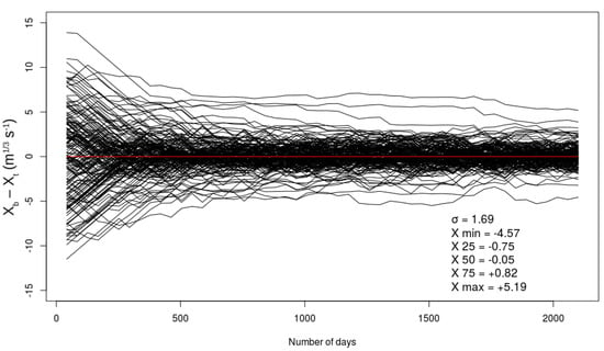 To keep the same ratio between the diagonal terms, σR and σB (see Equation (6)), of the two matrix, R and B (as the experiments detailed in the Section 4.1 and Section 4.2), the minimum value of σB is now fixed to 2.12 m1/3 s−1. This value is calculated from the diagonal terms, σB, equal to 1.5 m1/3 s−1 in the B matrix used in the two previous experiments. We show in Figure 9 the temporal evolution of the terms (xb − xt) for all reaches in the basin.