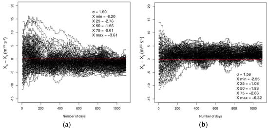 Temporal evolution (1 August 1995 to 31 July 1998) of the difference between the a priori control vector (xb) and the true control vector (xt) of the Strickler coefficients in the DA system. Scenario (a) represents a −10% perturbation of water produced by ISBA, and scenario (b) represents a +10% perturbation. The 165 black curves represent the value (xb − xt) of all 165 reaches defined over the Garonne catchment. The red horizontal line is equivalent to a zero difference between xb and xt. After 3 years (i.e., 548 48 h-assimilation windows), we represent the standard deviation, σxb, between the 165 values (xb − xt) in the basin. The X terms represent from top to bottom the minimum value, the 1st quartile, the 2nd quartile, the median, the 3rd quartile, and the maximum value of (xb − xt) at the end of the experiment (day n° 1096).
