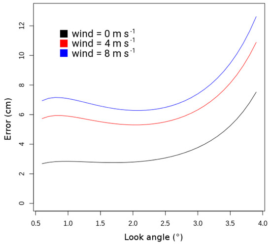 SWOT error measurement as a function of the look angle for a wind speed of 0 m s−1, 4 m s−1, or 8 m s−1.