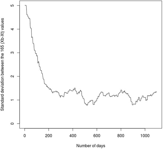 Temporal evolution of the standard deviation, σ, between the 165 (xb − xt) terms, over the 1 August 1995–31 July 1998 period.