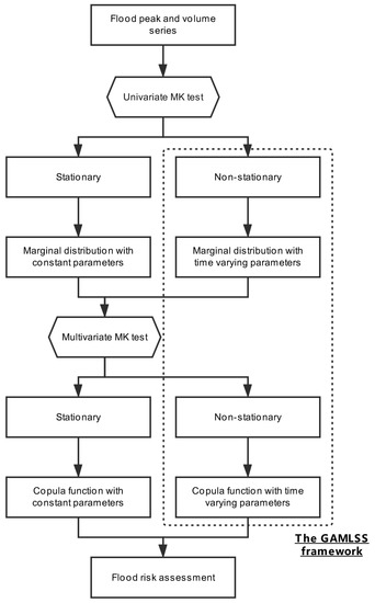 A flood is a natural hazard that may cause great damages to human civilization, and it is studied worldwide using hydrologic as well as hydraulic models [1,2]. Flood frequency analysis, a commonly used method in hydrological modeling, has been applied in the calculation of various design values, such as dams, bridges, culverts and many other hydraulic constructions [3,4]. However, the flood frequency analysis is based on some assumptions in terms of statistics, one of which is the well-known stationary assumption. As climate change and human activities intensify, the stationary assumption has faced more and more challenges [5]. Much research has been done to study the non-stationarity in a hydrological series. For example, Zhang et al. [6] used three methods to investigate the effect of dams and lakes on the streamflow series in the Yangtze River basin. Ishak et al. [7] used a regional Mann-Kendall test to explore the non-stationary properties in annual maximum flood series for 491 catchments in Australia. O’Brien and Burn [8] used a non-stationary index-flood technique to estimate the extreme quantiles of annual maximum streamflow. Most of the studies supported the proposition by Milly et al. [5] and concluded that a non-stationary modeling framework may provide valuable information for policy implementation and hazard prevention.