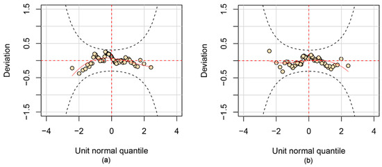 Worm plots for the time varying marginal distribution of (a) the flood peak series and (b) the flood volume series.