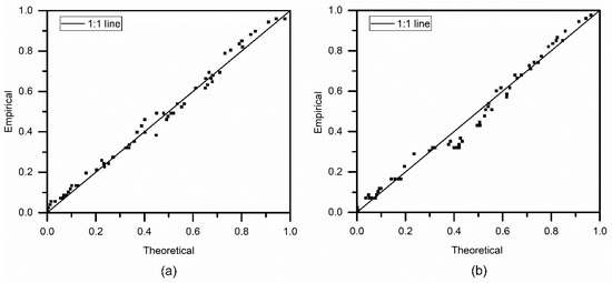 The dependence structure between flood peak and volume series was explored first in the multivariate frequency analysis. Using the three widely used relationship coefficients, the Pearson’s ρ is 0.90, Kendall’s tau is 0.75, and the Spearman’s rho is 0.91, indicating that the two variables are strongly correlated. Table 4 summarizes the parameters and goodness-of-fit results for the two models, and it can be found that all the copula functions of model 2 detected a decreasing trend of θ, which means the correlation relationship between the two variables weakened over time. Almost all the AIC values of non-stationary models are smaller than the stationary model when using the same copula function, except for the Clayton copula. The Frank copula of model 2 is the best fit for bivariate modeling of flood peak and volume among all scenarios. The relationship between empirical and theoretical probabilities for the Frank copula under stationary and non-stationary conditions was plotted in Figure 4. All points are located near the 1:1 line, indicating satisfactory fitting performance.