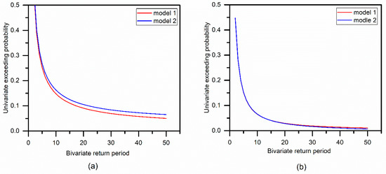 Based on the selected copula and estimated parameters for each model, the bivariate non-stationary return periods can be estimated by substituting Equations (15) and (16) to Equation (14). It should be noted that the non-stationary return period was defined for each year rather than the whole series. Following the Chinese flood guidelines [35], the unique combination of design flood peak and volume is determined by setting them to be of the same univariate frequency, which was a uniform procedure for similar calculations of design values in past studies [36]. Specifically, for the year 2012, the univariate exceeding probability against the bivariate non-stationary return period was presented in Figure 5. In case AND from Figure 5a, for a given return period, the univariate exceeding probability of model 2 is bigger than that of model 1, implying that the non-stationary model is safer than the stationary model under the same design standard. On the other hand, the non-stationarities have a very small influence on the return period of case OR, as shown in Figure 5b. The result was further evaluated by the design values. For example, the univariate exceeding probabilities under 10 years of the bivariate return period in case OR are both 0.065 for the two models, while the designed flood peaks (m3/s) are 62,202 and 63,127, respectively, and the designed flood volumes (106 m3/s) are 33,054 and 31,165, respectively. Model 2 is characterized by a higher flood peak and lower flood volume compared with model 1, which may be attributed to the time varying marginal distributions.