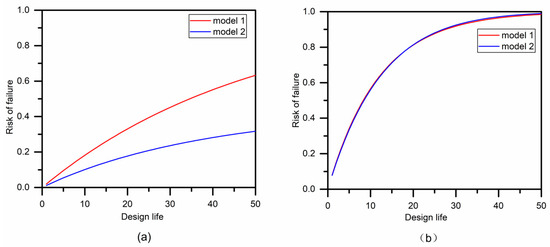 Bivariate risk of failure as a function of design life for (a) case AND and (b) case OR.