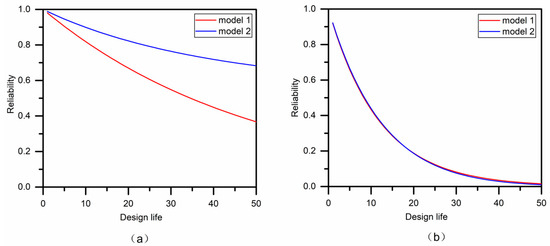 Reliability as a function of design life for (a) case AND, and (b) case OR.