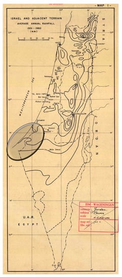 Rainfall for the year 1935 was taken from an average annual rainfall map (1931–1960), as shown in Figure 2. Twelve rainfall stations are distributed in the study area (Figure S2 in Supplementary Materials), with daily rainfall data since 1973. Daily pan evaporation data from 1986 to 1992 are available, while average daily evaporation was estimated before 1986 and after 1992. Daily rainfall and evaporation data were prepared from 1973 to 2016 as shape files on a yearly basis. The shape file attribute data include day of the year, rain gauge station coordinates (X and Y), daily rainfall (in mm), daily evaporation (in mm), and 5-day antecedent rainfall (in mm).