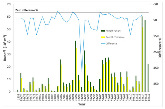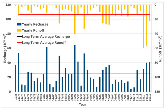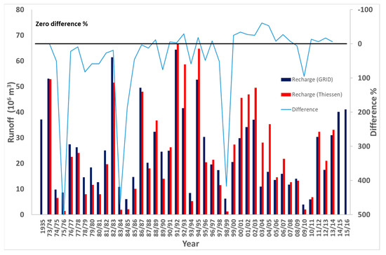 The differences between the two methods (GIS GRID vs. Thiessen polygon method) show a wide range for both yearly runoff and recharge. The largest differences occur in the dry years, where rainfall is lower than the long-term average (326 mm), as shown, for example, in the year 1975/1976. Figures S7 and S8 in the Supplementary Materials show a comparison between the two methods for selected years of lower and higher than long-term average rainfall, respectively. In general, it is indicated that the GIS GRID method provides a higher estimation than the Thiessen polygon method for both runoff and recharge when the rainfall is lower than the long-term average rainfall. In years with rainfall that was higher than the long-term average rainfall, the two methods’ estimations are similar.