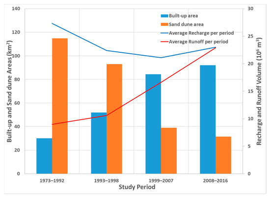 Built-up areas increased three times from the year 1982 to 2010 (from 30.1 to 92.1 km2), while the sand dune area decreased by more than 70% (114.8 to 31.5 km2) [5]. This dramatic change in land use activities increased the runoff from 9 to 22.9 million m3, and recharge decreased from 27.3 to 23 million m3 during the same land use evolution period (Figure 6).