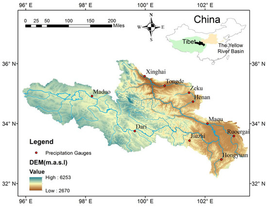 The source region of the Yellow River is located in the northeastern Qinghai-Tibetan Plateau (Figure 1). It has a total area of 121,972 km2, which covers about 15% of the Yellow River Basin. The SRYR is a mountainous region with a large elevation difference which ranges from 2670 m in the east to 6253 m in the west. The study area is dominated by a typical Qinghai-Tibetan Plateau climate system and presents a cold, semi-humid climate. Precipitation exhibits strong seasonal variability: More than 70% of the annual precipitation falls during the wet summer period (June–September) as the southwestern Asian monsoon from Bay of Bengal in the Indian Ocean brings rich moisture to the SRYR [20]. In the winter, precipitation is mainly controlled by the high pressure of the Qinghai-Tibetan Plateau; more than 78% of precipitation falls in the form of snow. However, due to the small portion of winter precipitation relative to the annual precipitation totals, snowfall accounts for less than 10% of the annual precipitation [19,36]. Precipitation in this region presents a low intensity (<50 mm/d), long duration (1–30 days) pattern, and covers a large area (>100,000 km2). The mean annual precipitation displays a strong spatial variability, ranging from 800 mm/a in the southeast to 200 mm/a in the northwest.