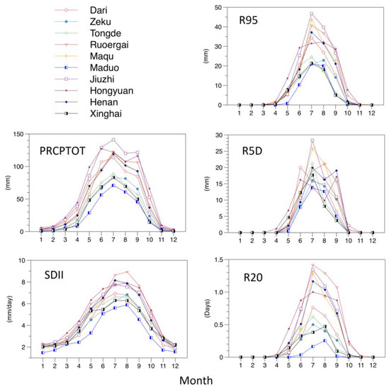 Extreme heavy precipitation (represented by R95, R5D, and R20) shows a similar seasonal pattern as total precipitation at most locations (Figure 2). Extreme heavy precipitation events mostly happen between May and October with July as the peak value month at most locations. Exceptions are seen at Dari and Hongyuan, where the peak value appears in June for R5D. The ranks of the magnitude of R95 and R5D are consistent with those of monthly total precipitation regarding the locations. However, R20 displays different consistency: R20 at Ruoergai has the highest value while the total precipitation ranks 3rd among the 10 locations, which indicates that precipitation at Ruoergai exhibits a higher intensity and lower duration pattern compared with precipitation at other locations. SDII shows a similar spatial pattern with R20. However, SDII at Ruoergai, Hongyuan, Zeku, Xinghai, and Maduo present different seasonal patterns from total precipitation. In other words, the peak average daily intensity at these locations happens in the month (August) when the total precipitation is not the highest, which may due to fewer rainy days in August at these locations.