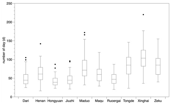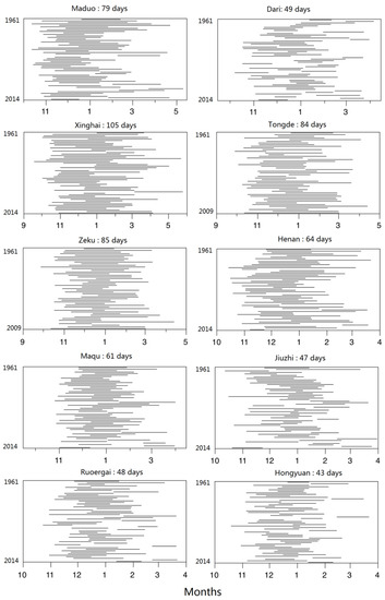 The extreme dry conditions (represented by CDD) mostly happen in the winter season (Figure 3). December and January are the two months with the highest frequency for consecutive dry days. Xinghai has the longest average dry period, with 220 consecutive dry days in the historic records (Figure 4). Although the average monthly total precipitation of Maduo is the lowest, the average CDD of Maduo is much lower than that of Xinghai (ranking 4th among the 10 locations). In other words, low precipitation does not necessarily mean extreme dry conditions. An integrated analysis of extreme precipitation indices provides a more complete picture of extreme conditions.