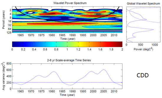 Figure 5 shows local and global wavelet spectra for annual regional average CDD time series. There is a strong 2–8 year band, which is possible evidence of the ENSO signals. R20 and R5D (Figure A2 and Figure A3) also show a 15-year band, which may be caused by PDO modulation of ENSO signals [42,43]. SDII does not present significant 2–8 year bands (Figure A5), indicating that ENSO may have little effects on variability of SDII. The same conclusion was also found in the western United States [15].