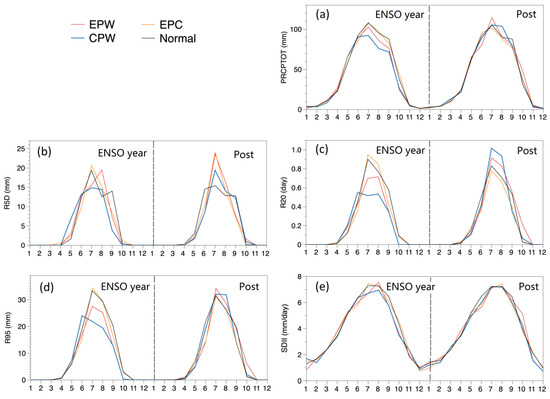 Monthly extreme precipitation indices in and after an ENSO year. (a) represents SDII; (b) represents PRCPTOT (total precipitation); (c) represents R95; (d) represents R5D; (e) represents R20.