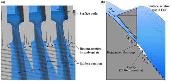 Schematic of the general flow pattern and aeration mechanism of the stepped spillway combined with X-shaped FGP: (a) 3D air-side view and (b) side view.