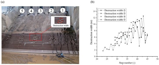 (a) Photo of damaged steps and (b) measured destruction width after the 2015 flood at the Ludila dam spillway.